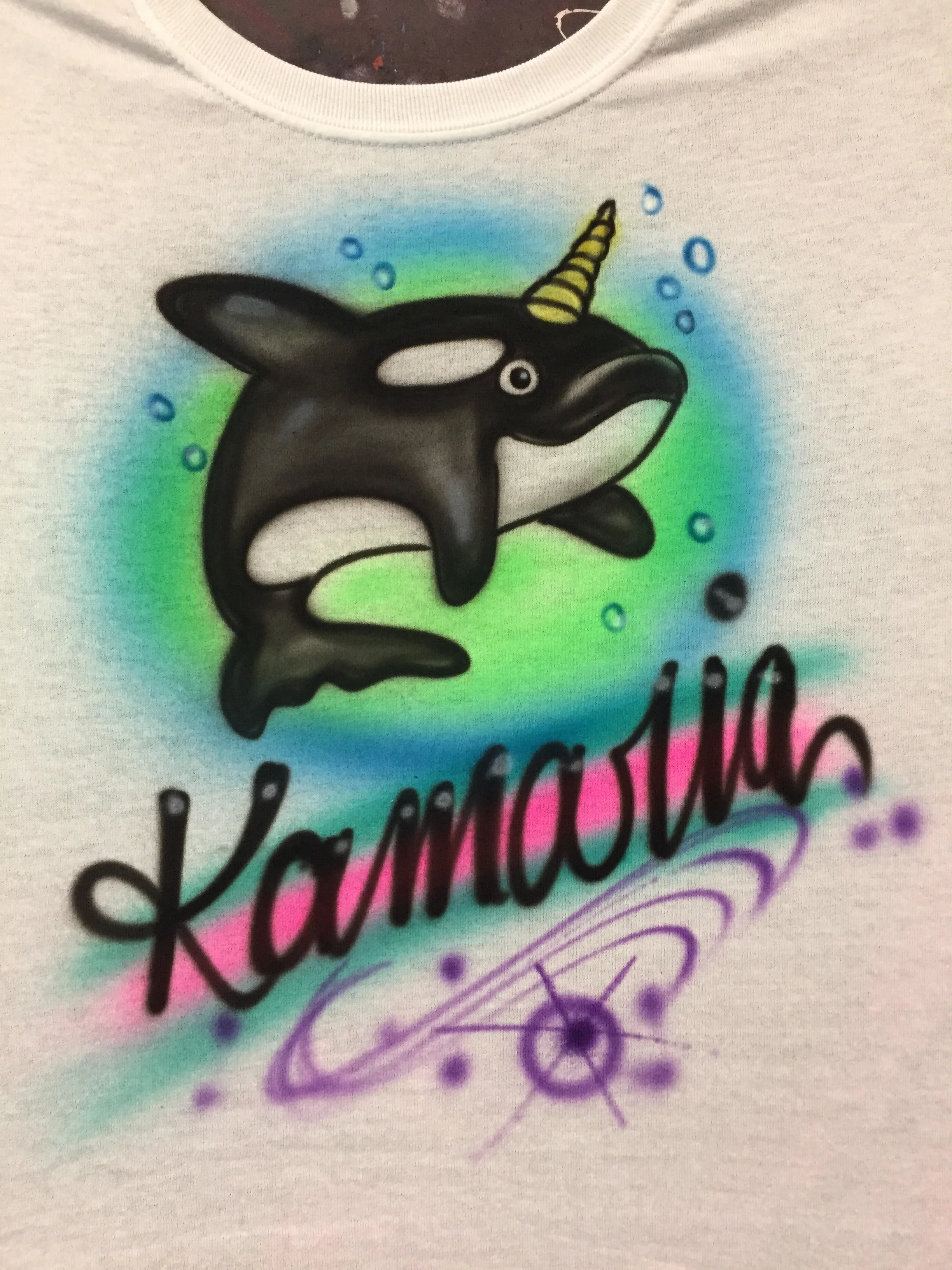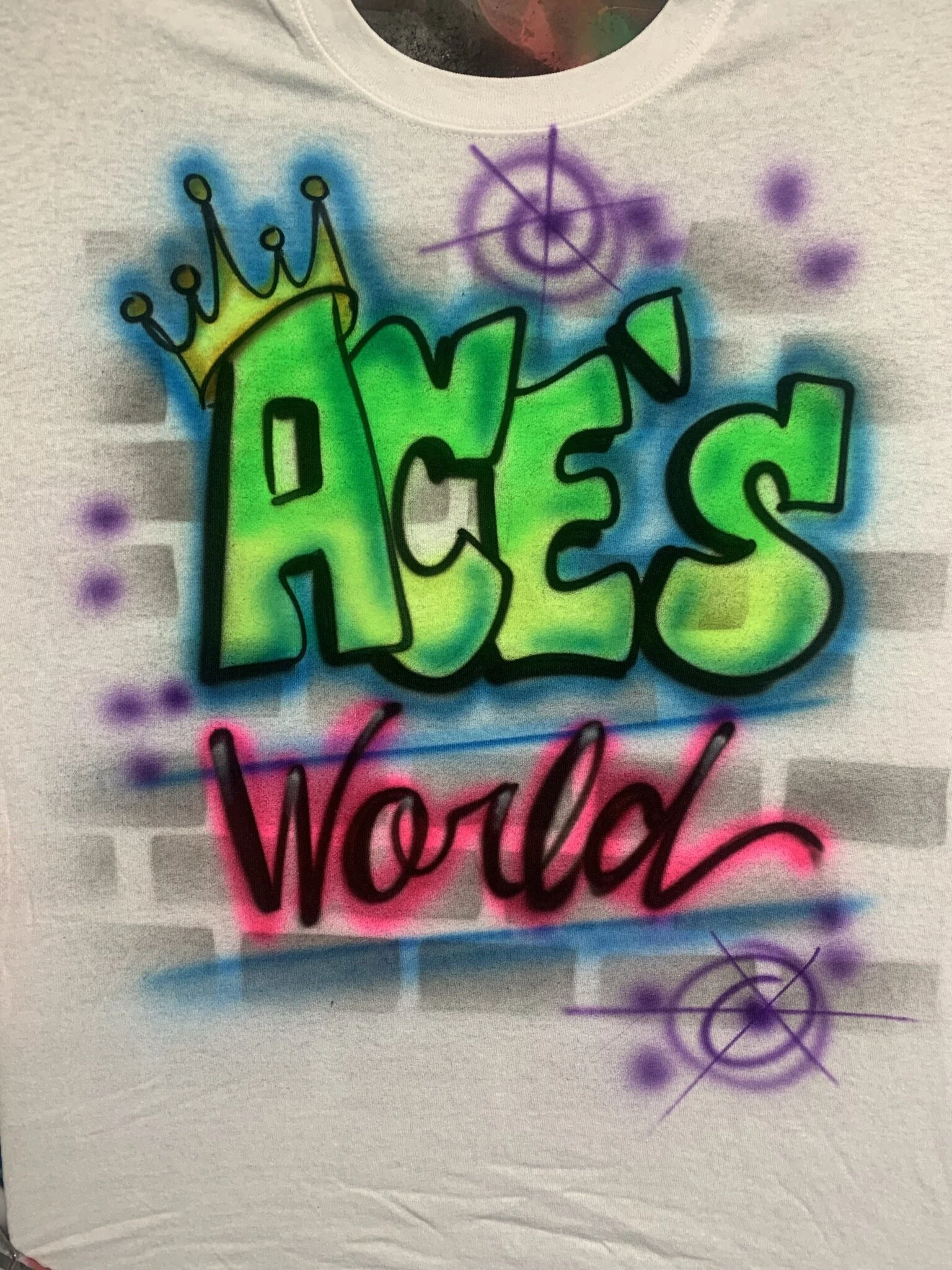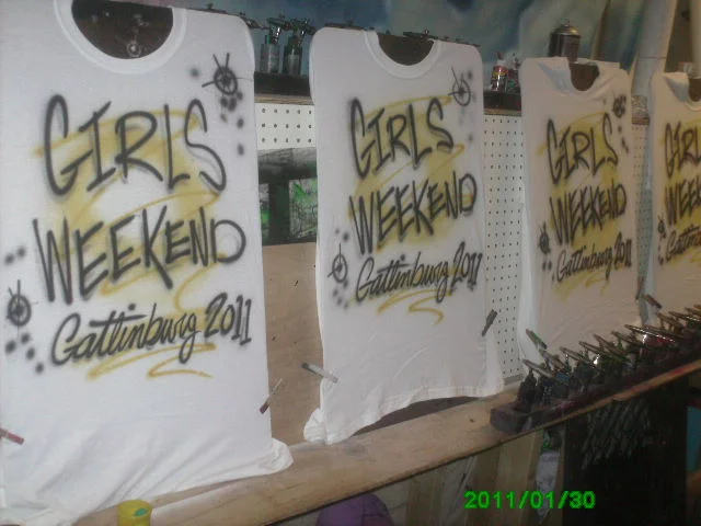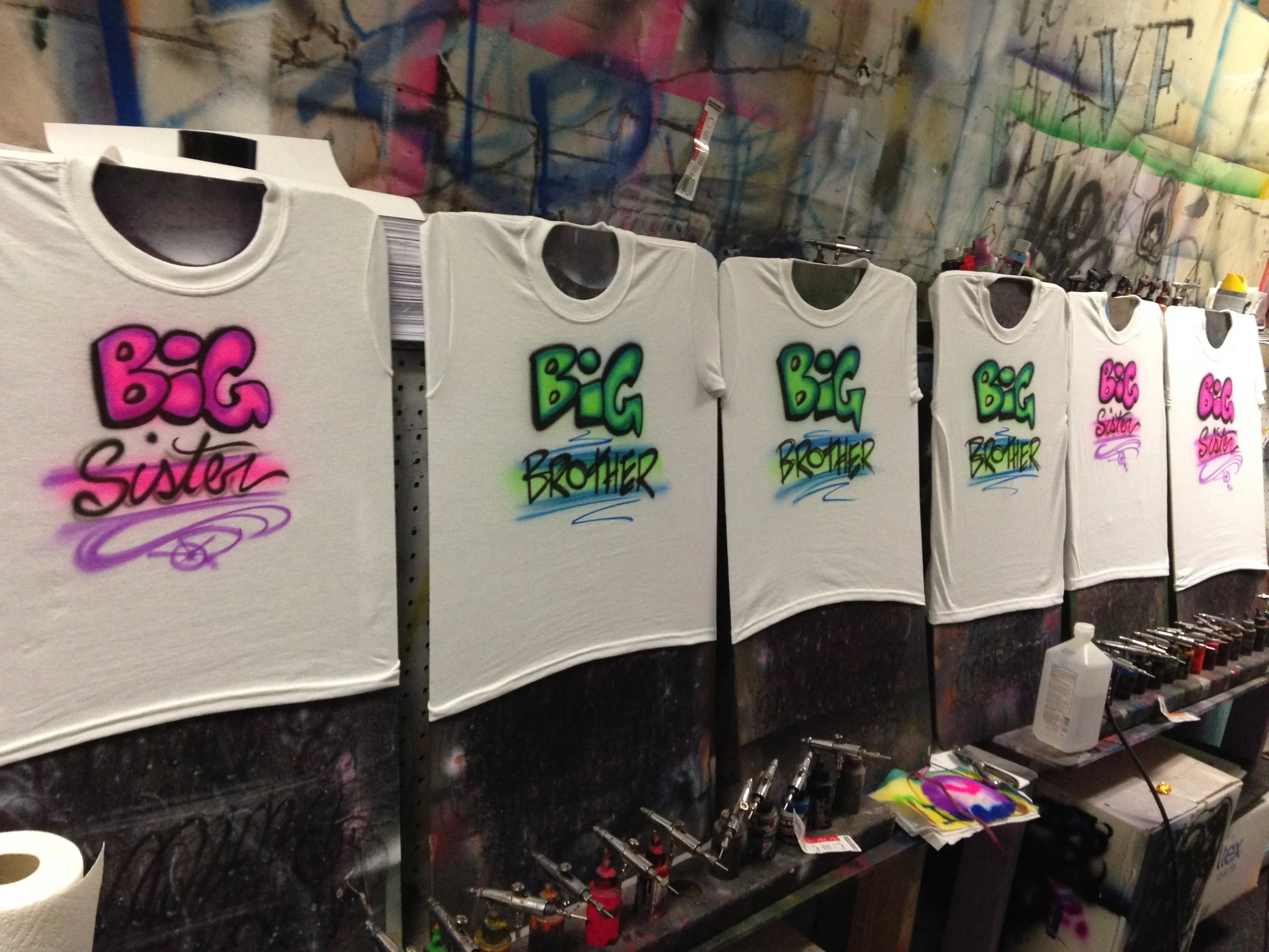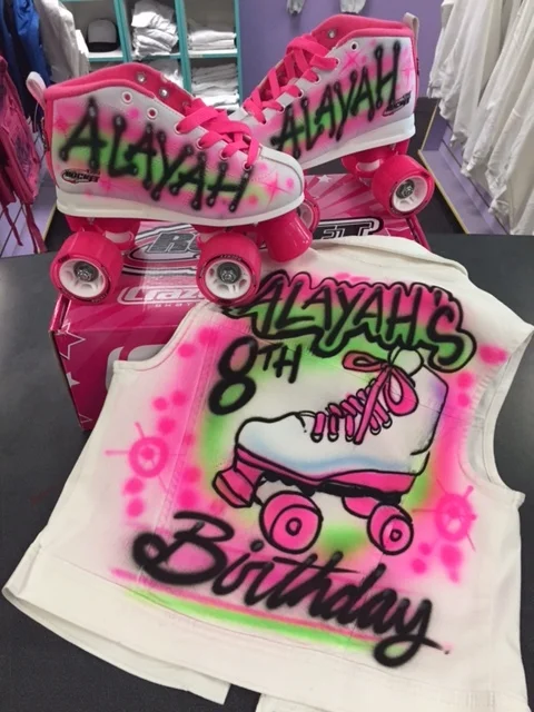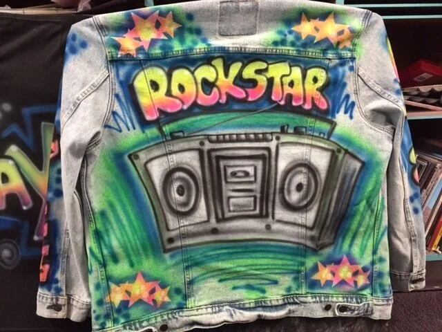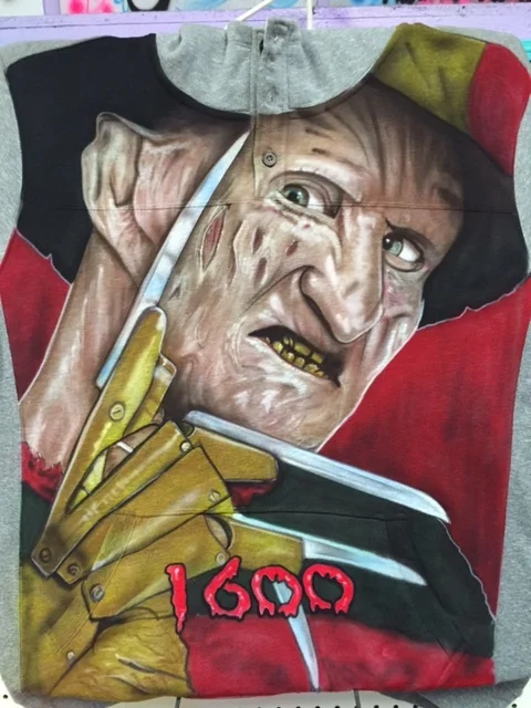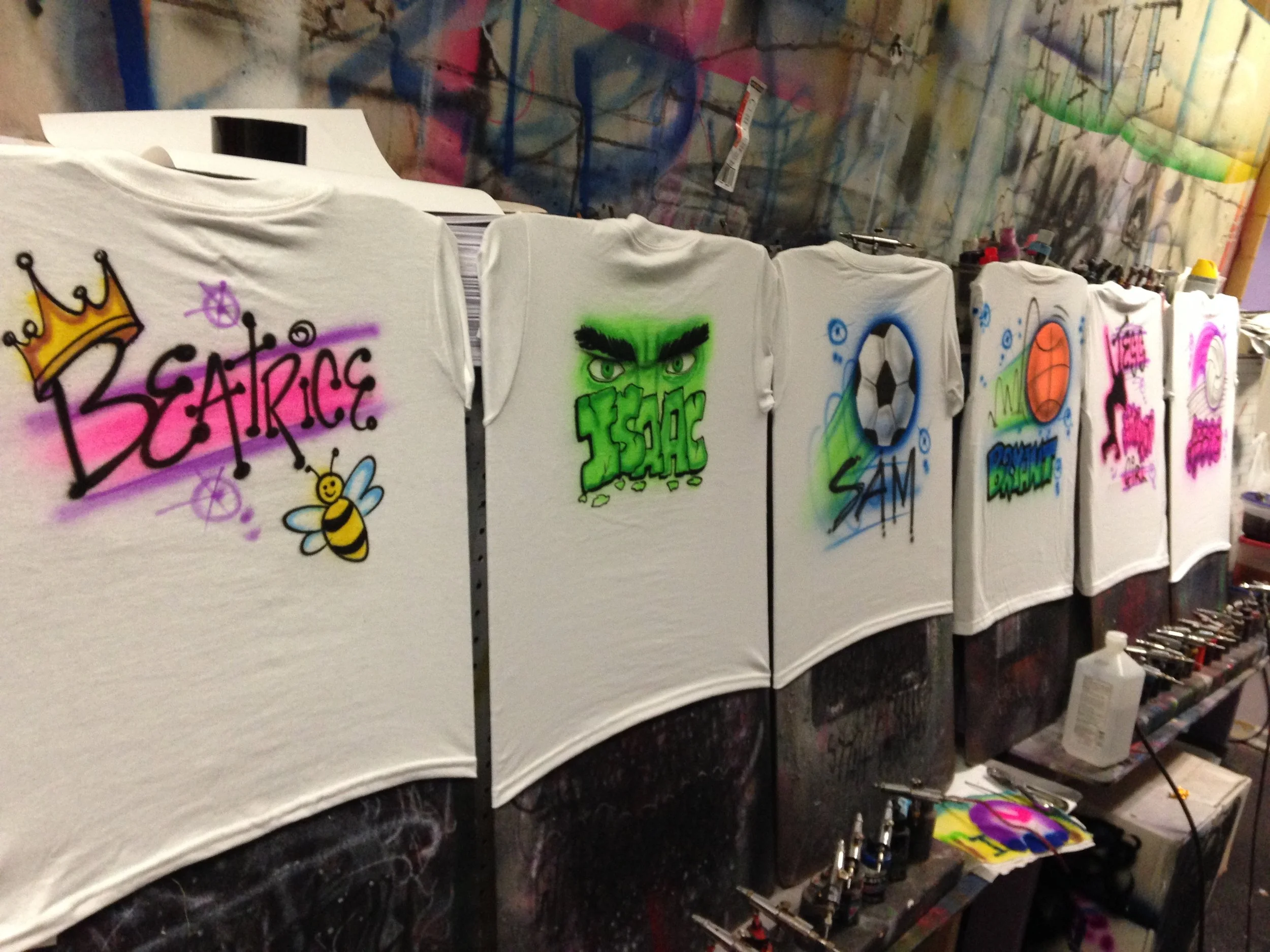 Below are some example of “custom artwork” Which pretty much means anything that is NOT one of our standard designs or an alteration to one of our existing designs or something that is not done on one of our standard items. This can range anywhere from a favorite saying, a name and number added to the back of a shirt, something airbrushed onto a pair of your jeans, something airbrushed on a pair of your shoes or something more detailed like a portrait, helmet, motorcycle tank etc…