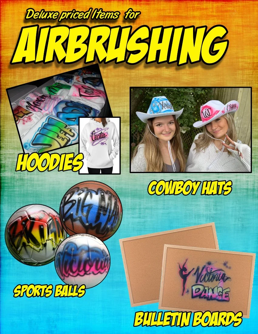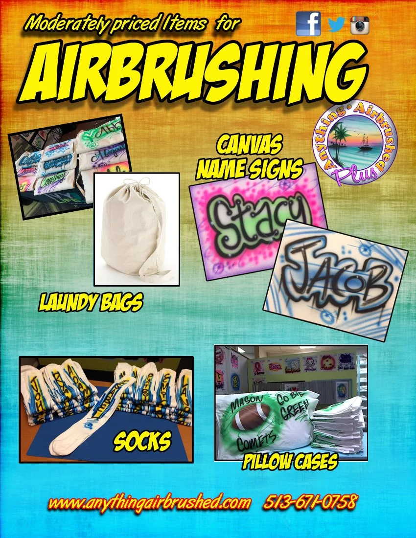 Click on the pictures below to view your different choices of items we can airbrush for your guests at your events. Remember, we are not just limited to these items. If you have an item in mind that you would like us to airbrush then please call us at 513-671-0758 or email us at artist@anythingairbrushed.com to discuss your idea with one of our artists.