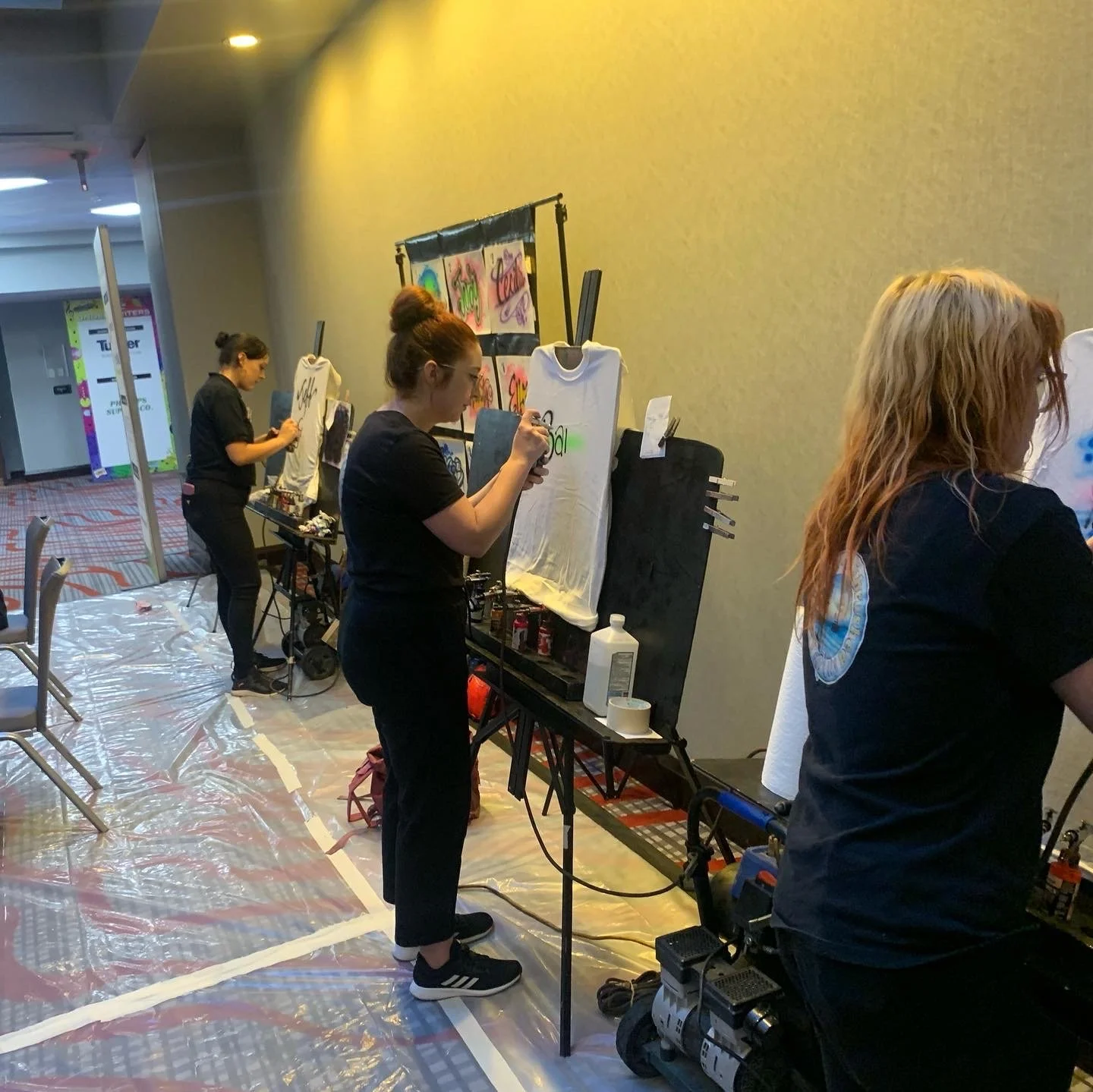 So for example, a college event where we are going to be there for 4 hours and they are hoping to be able to give away 400 items....doing the math of 20-30 items per hour per artist we would need at least 3 artists to be able to get 400 items painted in 4 hours so we figure in how much each artist is getting paid plus the wholesale cost of the 400 shirts. Then if the client decides they want more artists on top of the 3 we suggested, then we take the amount we are paying the artists plus the number of items each additional artist will be painting in 4 hours. This is where a lot of artist screw up their pricing. They charge extra to have more artists but they forget that each additional item that each additional artist will be painting costs them money also.