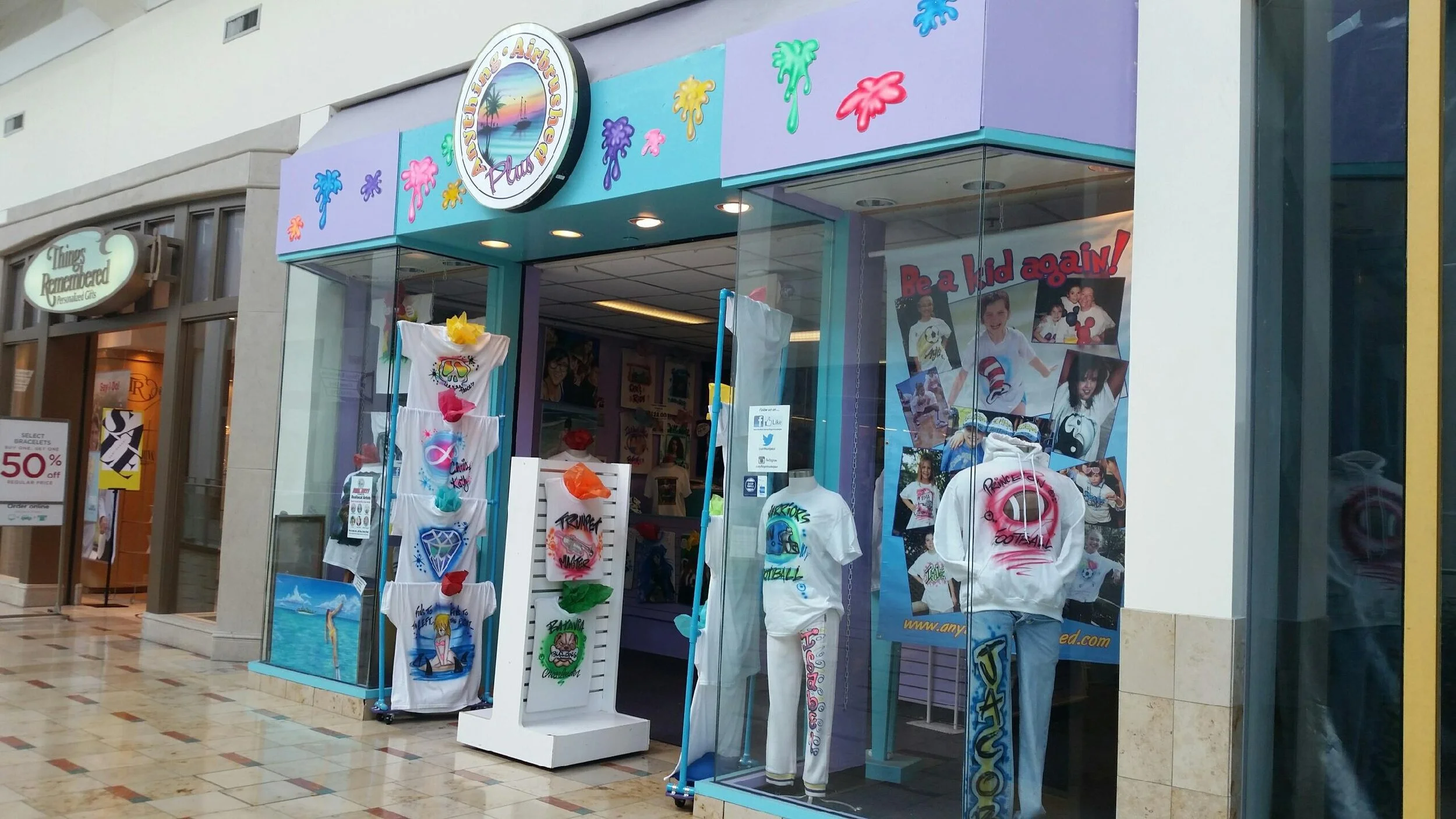 We try to always incorporate shirts and other items that pertain to that specific holiday or theme, but we really like making it fun. It all else fails we settle for just a window of shirts or a banner. We have also started putting a monitor in the window playing a video of our artists at work that is just looped all day to play over and over. Take a look at these examples and feel free to comment and ask questions.